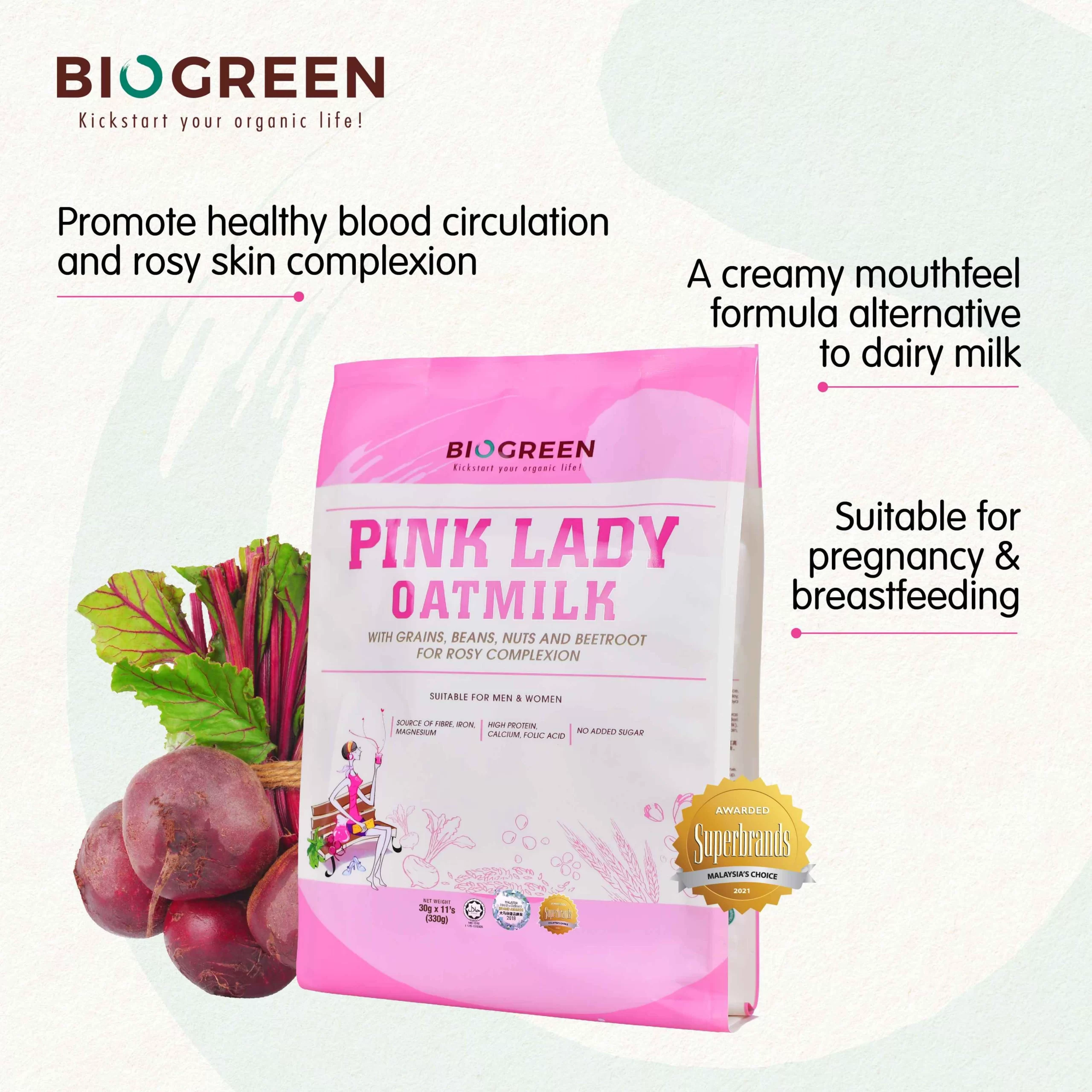 Biogreen Pink Lady Oatmilk is a highly nutritious beverage loaded with organic oats, 10 types of natural unrefined grains, beans and nuts, with no added sugar. It also contains beetroot, which serves as good source of iron and folic acid for rosy skin complexion and healthy blood circulation. Pink Lady Oatmilk is a non-dairy beverage suitable for all ages, especially those with malnutrition, anemia, poor bowel movement or dull skin.